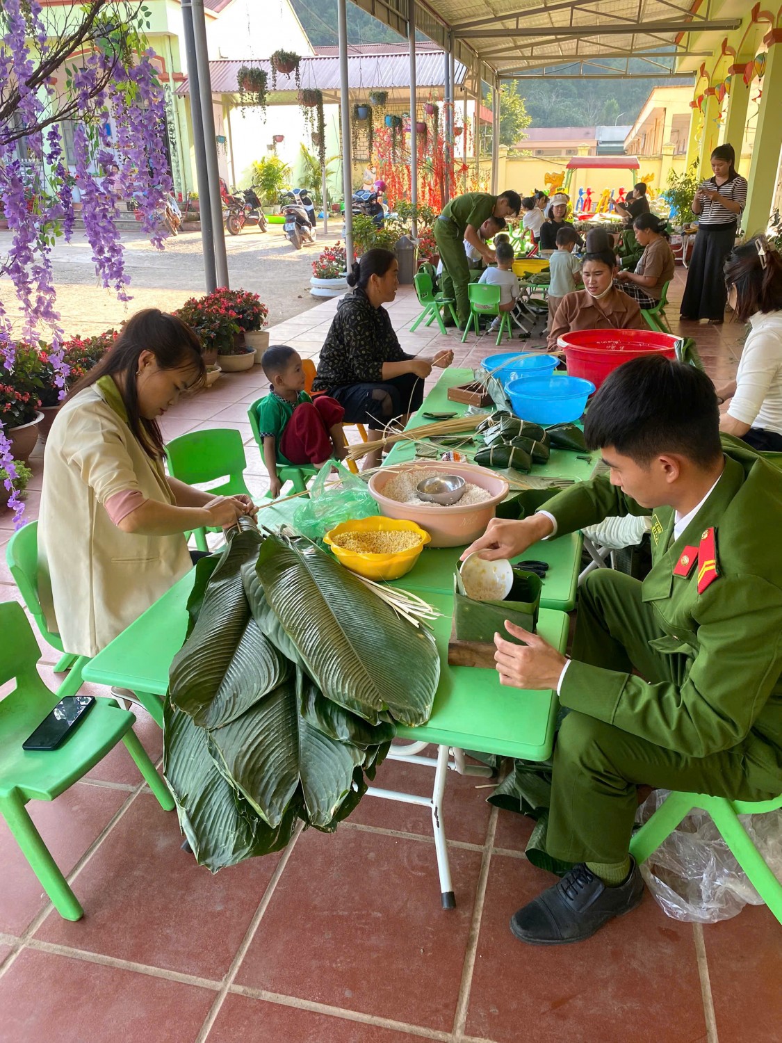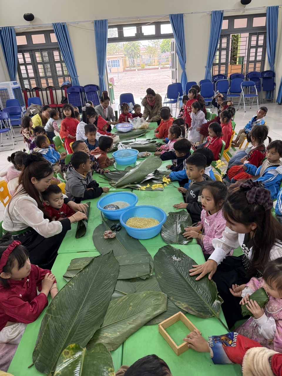 Sau phần văn nghệ, các bé được tham gia hoạt động trải nghiệm gói bánh chưng - nội dung chính của ngày hội. Hoạt động được tổ chức với sự phối hợp chặt chẽ giữa nhà trường, các bậc phụ huynh và Đoàn Thanh niên Công an phân trại tạm giam Nà Hỳ, tạo nên không khí đoàn kết, thân thiện và giàu ý nghĩa giáo dục.